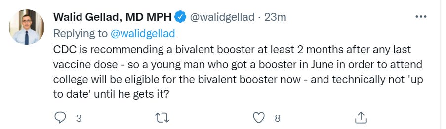 To the extent ‘up to date’ here means ‘what it takes to be allowed to go to school’ or otherwise not be excluded from ordinary life activities, then we have an absurdist problem. Given only ~30% of the public is even boosted once, these worries focus on colleges and other places where social dynamics and signaling games force crazy public health (and other cultural) obsessions onto victims who don’t in practice have the choice of exit.