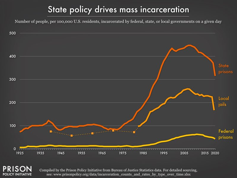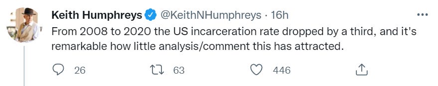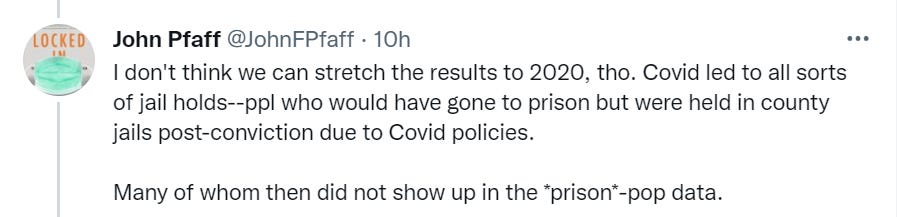 The sharp drop at the end is the pandemic, as ‘prosecutors were reluctant to put people in jail if they could avoid it’ which raises the question of why one isn’t reluctant to do so in normal times. Jail is quite destructive.