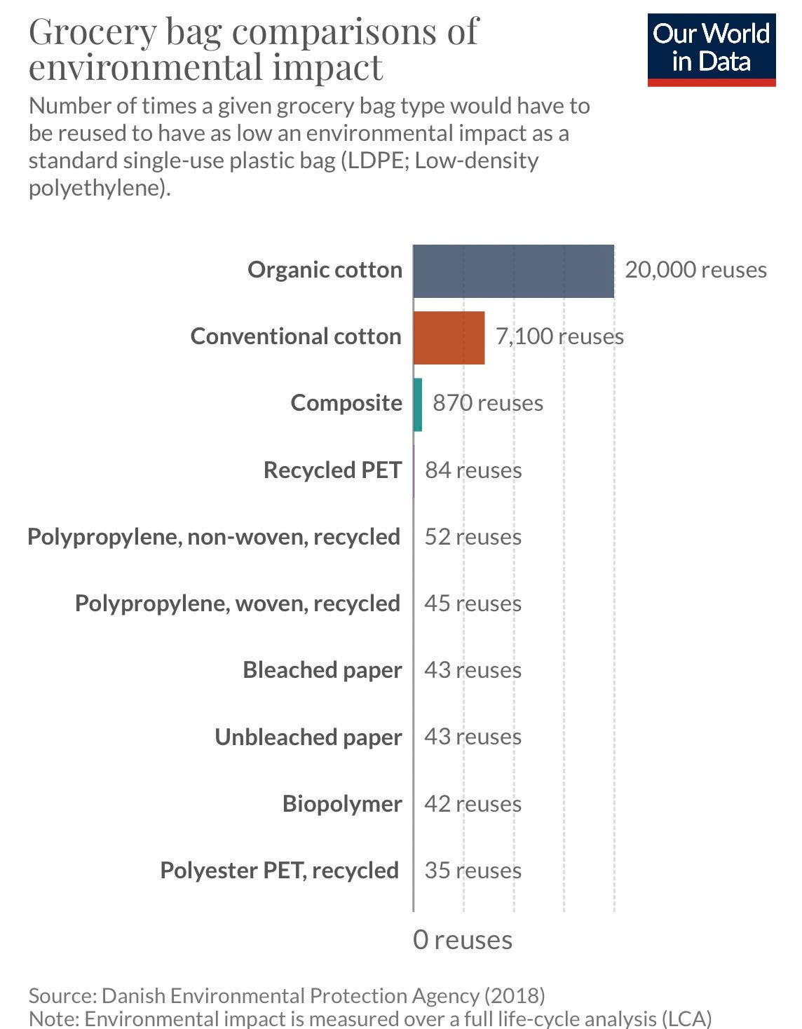 If you're only concerned, say, about climate change, the actual figure for a cotton bag is only 50 times, which is quite reasonable (I do in fact use cotton bags for shopping, mostly for aesthetic reasons and I've certainly used them more than 50 times).