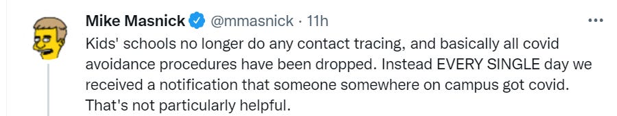 “I think business should start to normalize the work day” says Scott Gottlieb. Seems like a better time than waiting longer. Either you have a work day going forward or you don’t, it’s not like anything is going to improve much if you wait. He feels the need to cite the new booster and therapeutics and such, which help on the margin I suppose. We all need our fig leaves.