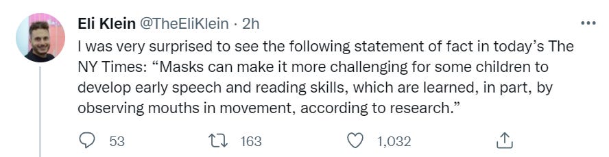 Doctor’s offices are the place where mask mandates would make the most sense, because those masks arguably made sense before Covid to protect against other things. Reports are that masking has become far less universal at doctor’s offices. The link reflects the attitude where anyone in a mask is labeled ‘safe’ and anyone not ‘unsafe,’ if you are worried about two unmasked people at the doctors’ office (one of whom was behind a glass wall) then you should be more worried about
