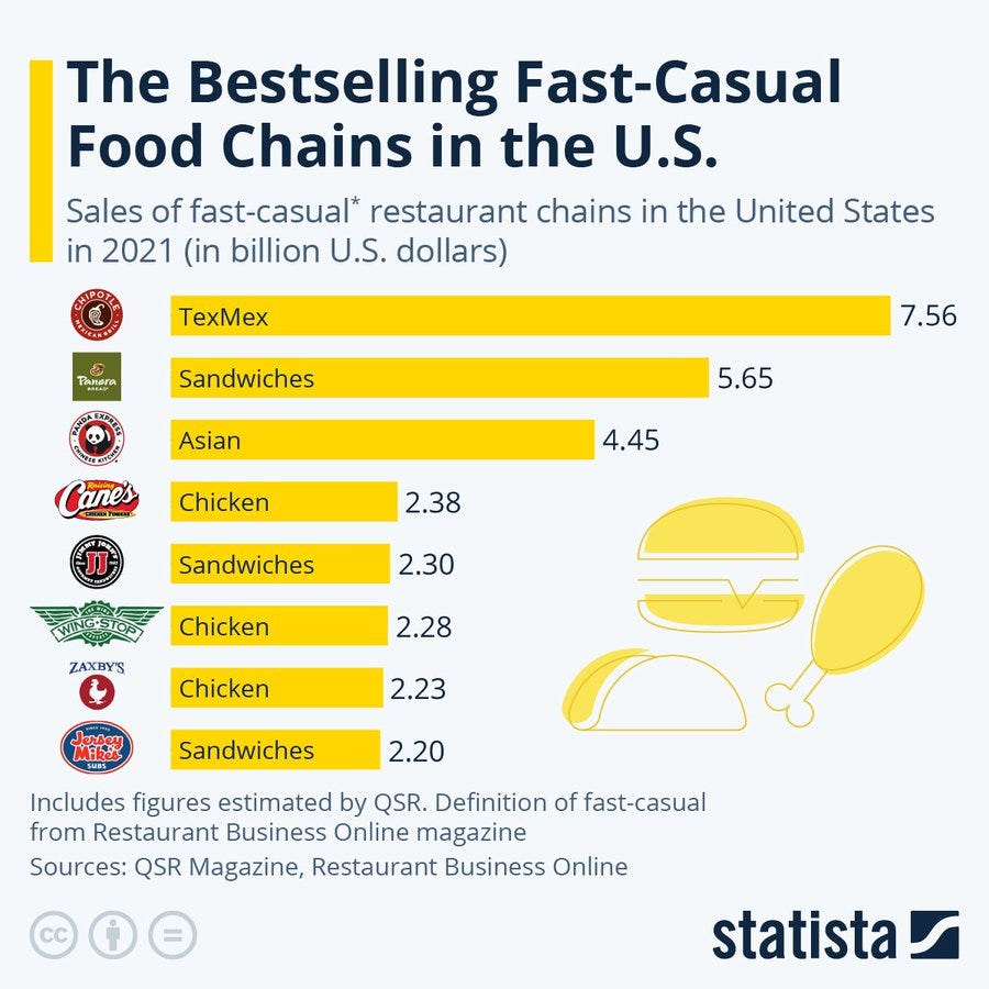 Best selling fast-casual food chains in the USA, list and category both are weird.