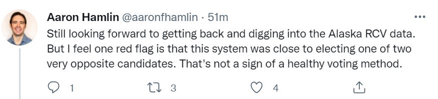 Ranked choice voting is in the news, as it gives the Democrats (presumably highly temporary) control of Alaska’s house seat due to some weird dynamics. That means that this week Team Blue loves ranked choice voting and Team Red hates ranked choice voting. I fear this is a setback for the practice. It raises so many red flags.
