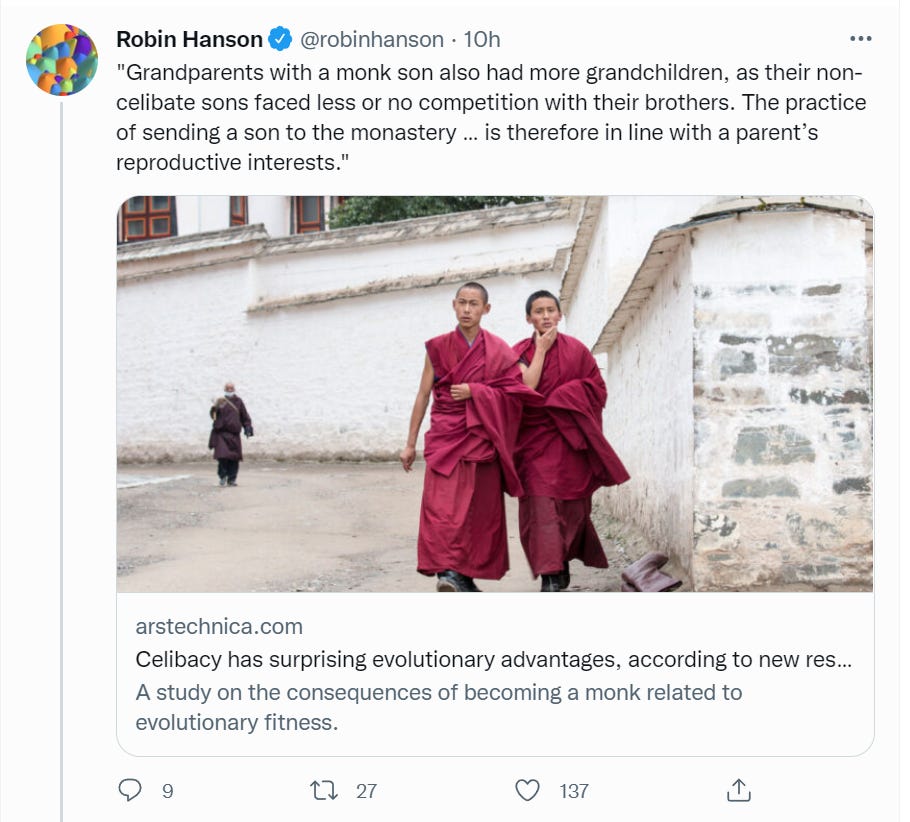 The effects found were large, only in brothers of monks and not in sisters.. Results are broadly consistent with wealth and reputational effects, except that magnitude is still bizarrely high, large enough to make the calculation close. It still does seem like from a purely reproductive perspective, if there are no hidden selection effects, those with only two sons who do this are still making a mistake.