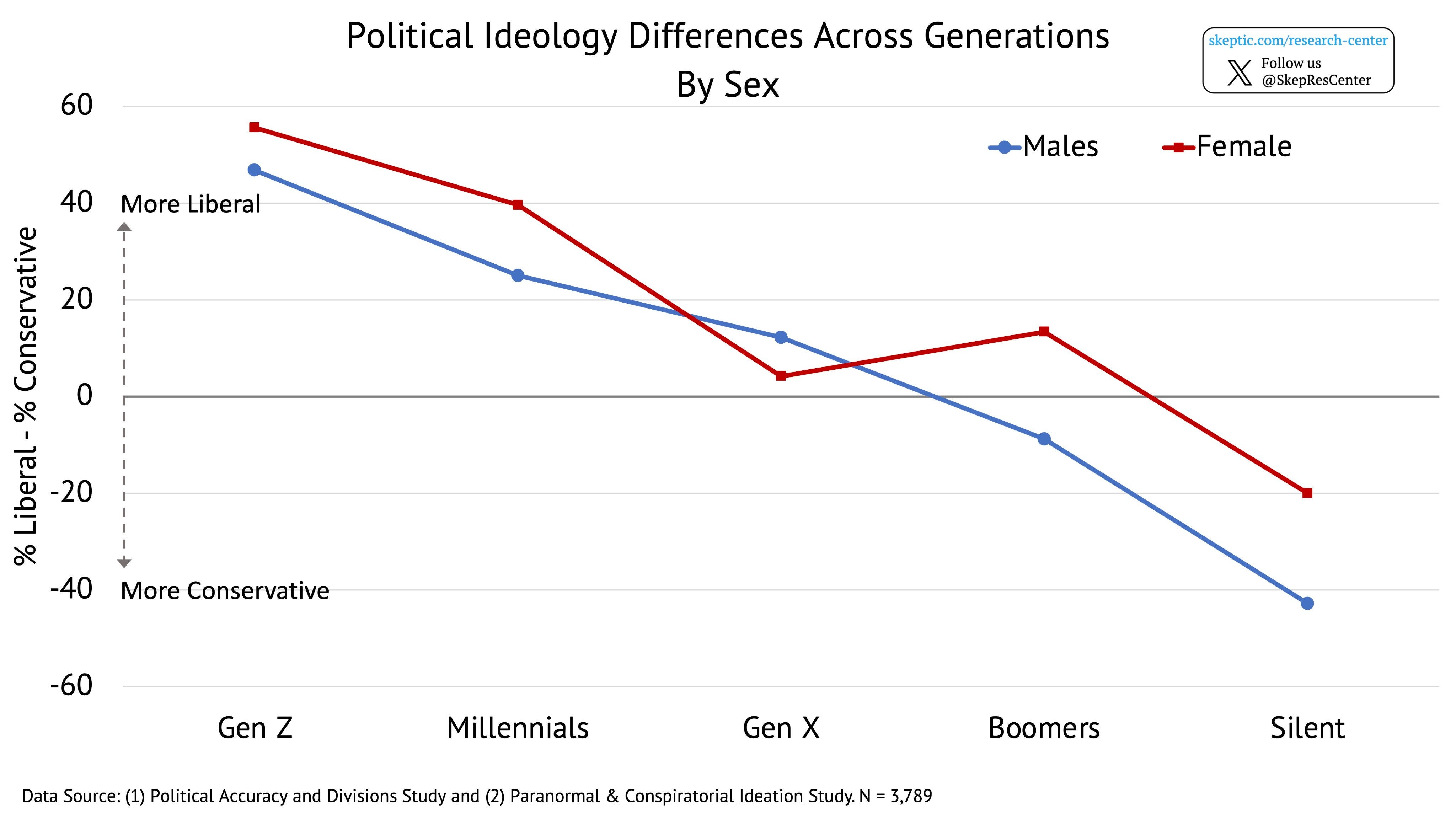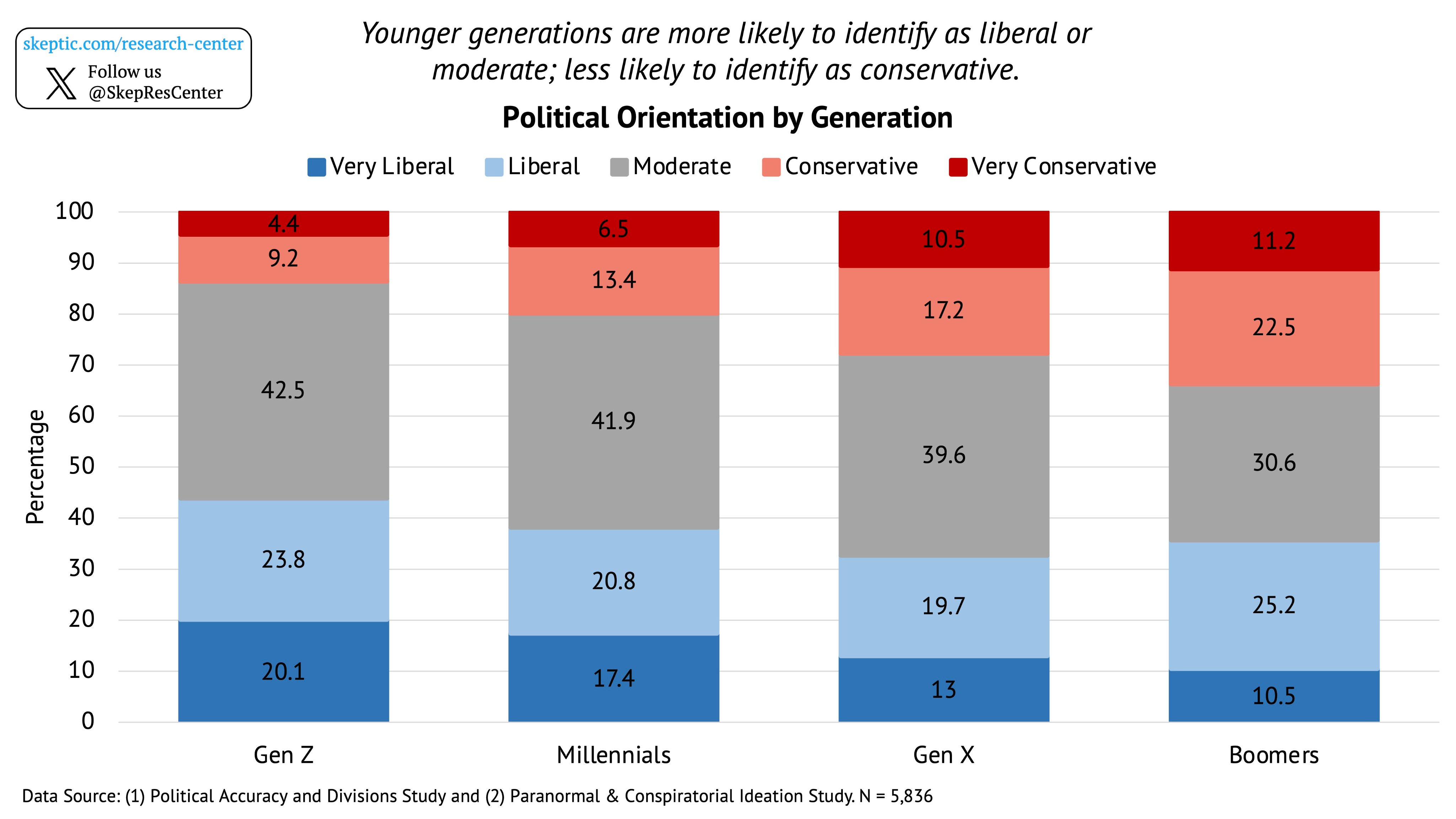 Skeptic Research Center Team: Our snapshot of five generations of the American public indicates that the gap between men and women is smaller in younger generations because men and women are both becoming more liberal (see chart on the left below). Importantly, our data also indicate that a growing percentage of Americans are identifying as moderate (see chart on the right below).