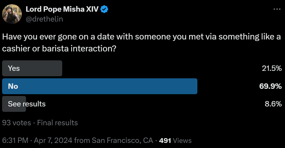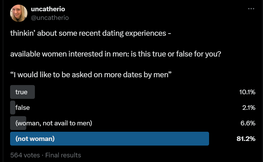 3. The incel movement is a detailed UX complaint about Tinder, as far as I can tell. Other apps vary quite a lot! Sometimes switching to a new app and keeping the same strategy has outsized returns.