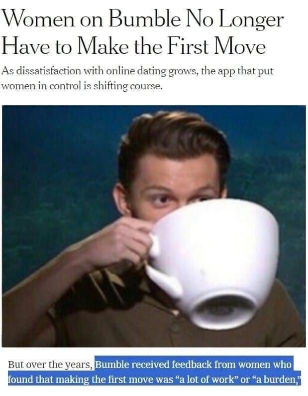 Hardcore Siege: It's such ridiculous headline. I have never gotten an opener on Bumble besides "hey", women never actually work go start a conversation or have a good opener, they're literally just re-approving the ability of the man to start the conversation.