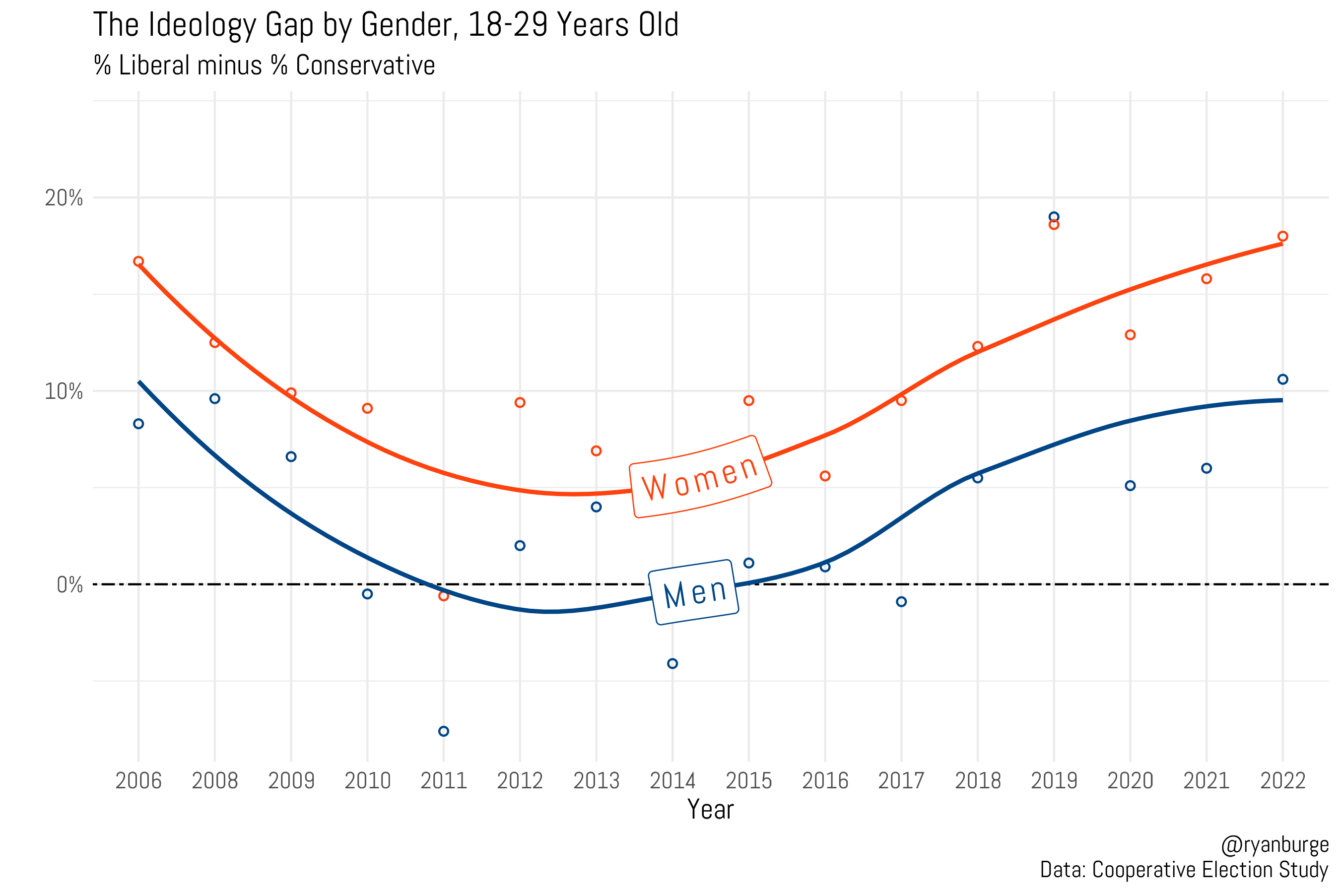 Ryan Burge: The finding that young women are becoming a lot more liberal [from the above graph] while young men are becoming a lot more conservative DOES NOT REPLICATE in the Cooperative Election Study. In fact, the two lines have run in almost perfect parallel for the last 15 years.