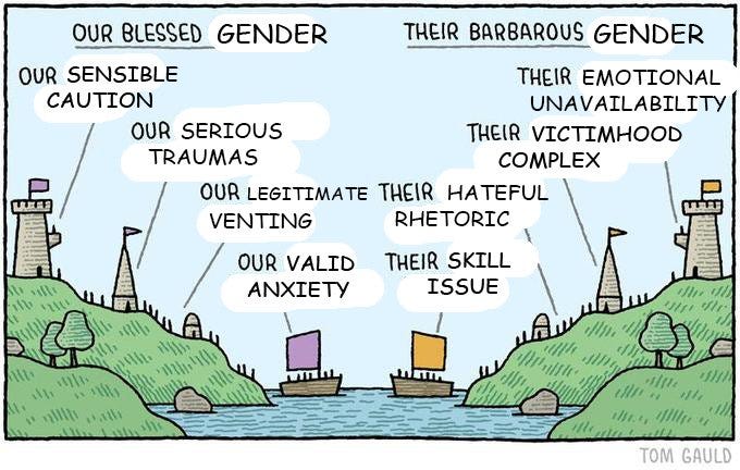 I used to be woke about gender until I delved into dating site statistics. Talk about a red pill. I think the biggest wakeup call was seeing that something like 99% of conversations were initiated by men. Taken together with everything else, it's pretty obvious that men and women are different. And the most successful couples, in my experience, are the ones who acknowledge and celebrate those differences rather than pretend they aren't there.