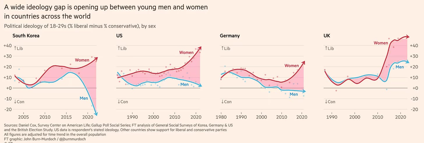 The men, this data claims, are getting more conservative, in many ways even more conservative than older men. The women are getting more left-wing. Neither finds the other’s politics alluring, even more than usual.