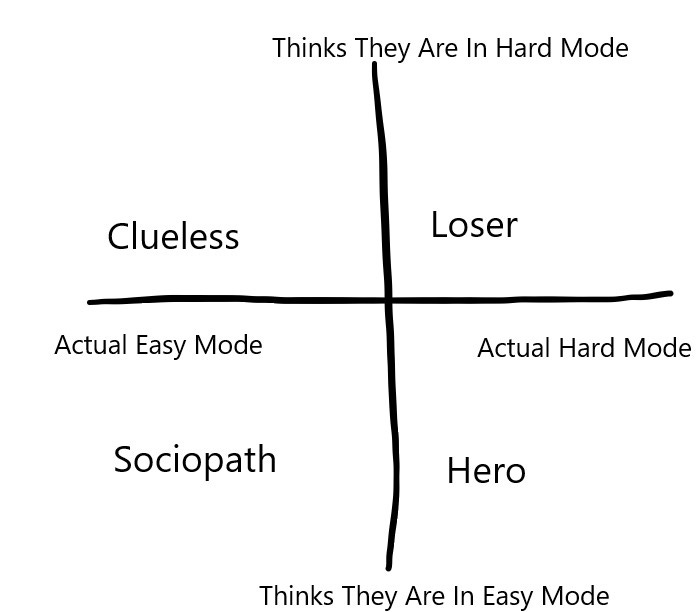 Figure 1: Easy and Hard Modes, 2x2 (Easy, Easy) is Sociopath. They know what they want and they get it. They don't care about anything else. (Easy, Hard) is Clueless. They enforce the rules of the system, thinking they are fighting for something that matters, but instead are being tricked, either the tools of others or fighting for lost purposes. (Hard, Hard) is Loser. They care about things that matter to them, even if that means they'll work harder for less. They know the game and choose not to play. (Hard, Easy) is Hero. The Hero thinks they are in Easy Mode, but their Easy Mode goal is to actually accomplish or create the thing. The Hero focuses on cutting the enemy. The Hero doesn't think they're a hero. The hero often doesn't even want to be a hero. The hero simply wants something you can't cheat on. It isn't a choice. The hero is a hero despite themselves. Rao is a hero. He would be the first to say, he isn't one, and also, don't be one. Doesn't matter. He is one anyway. Meanwhile, as corporations create more and more of the things, and/or those things are built to hit explicit optimization targets, those things are built or 'improved' by Sociopaths directing the Clueless. Which all means, of course, Premium Mediocre. III How does this relate to things that are Actually Good? It is common for Premium Mediocre things to in some aspect be Actually Good. The catch is that they are, whether in terms of money, time, or something else, expensive. Often, the easy path to making something superficially premium is to make the thing actually premium! You can then get the delicious high-grade mediocrity you crave, but you pay for it. As Rao points out, Cupcakes are Actually Good. I love me a cupcake, but they are still Premium Mediocre, whereas cake brings you even more Actually Good at a fraction of the price. He also claims Avocado Toast is Actually Good, which it might well be. I've never had it. What I know for sure is that it is shockingly expensive for a vegetable on a piece of toast. Same thing with Starbucks Coffee. I don't drink coffee, but by all accounts it's good - it's just shockingly expensive for what it is. I've had their hot chocolate, which is both good and shockingly expensive. The finest wine at Olive Garden is premium mediocrity on top of premium mediocrity, so it's going to be super expensive for what it is, but it's still probably better than the median wine at Olive Garden. This is my resolution of what Rao calls the Avocado Toast Paradox. This is not premium mediocrity deciding to occasionally treat itself, it is simply that Goodhart's Law is not perfect. What premium mediocre cannot be, is Perfectly Good or Really Good. And it certainly can't be Insanely Great. Things which are superficially flawed, but which do their functional job just fine thank you, are Perfectly Good. Perfectly Good things satisfice on functionality and entirely ignore superficiality. There, I Fixed It is their official website and slogan. If something is either Actually Good or Perfectly Good, and that is surprising, then it is Not That Bad. An easy way to end up with a premium mediocre product is to discard the Perfectly Good. We throw out Perfectly Good tomatoes because they don't have the right shape. This results in premium mediocre produce. We throw out a Perfectly Good old and comfortable sofa, rather than patch it with duck tape. Instead we buy one from premium mediocre IKEA. My parents would not have dreamt of throwing out something that was Perfectly Good. Some products and experiences are the best versions of themselves. Given the restraints of their format and budget, they exceeded all your expectations. These are not merely Actually Good, they are Really Good. There's nothing wrong with the Actually Good, but the Really Good will brighten up your day. You go out of your way for the Really Good. If something spares no expense, with full attention to every detail, and still blows you away despite that, it is Insanely Great. Insanely Great changes your life. Things that are some combination of Really Good and Insanely Great are The Real Thing.