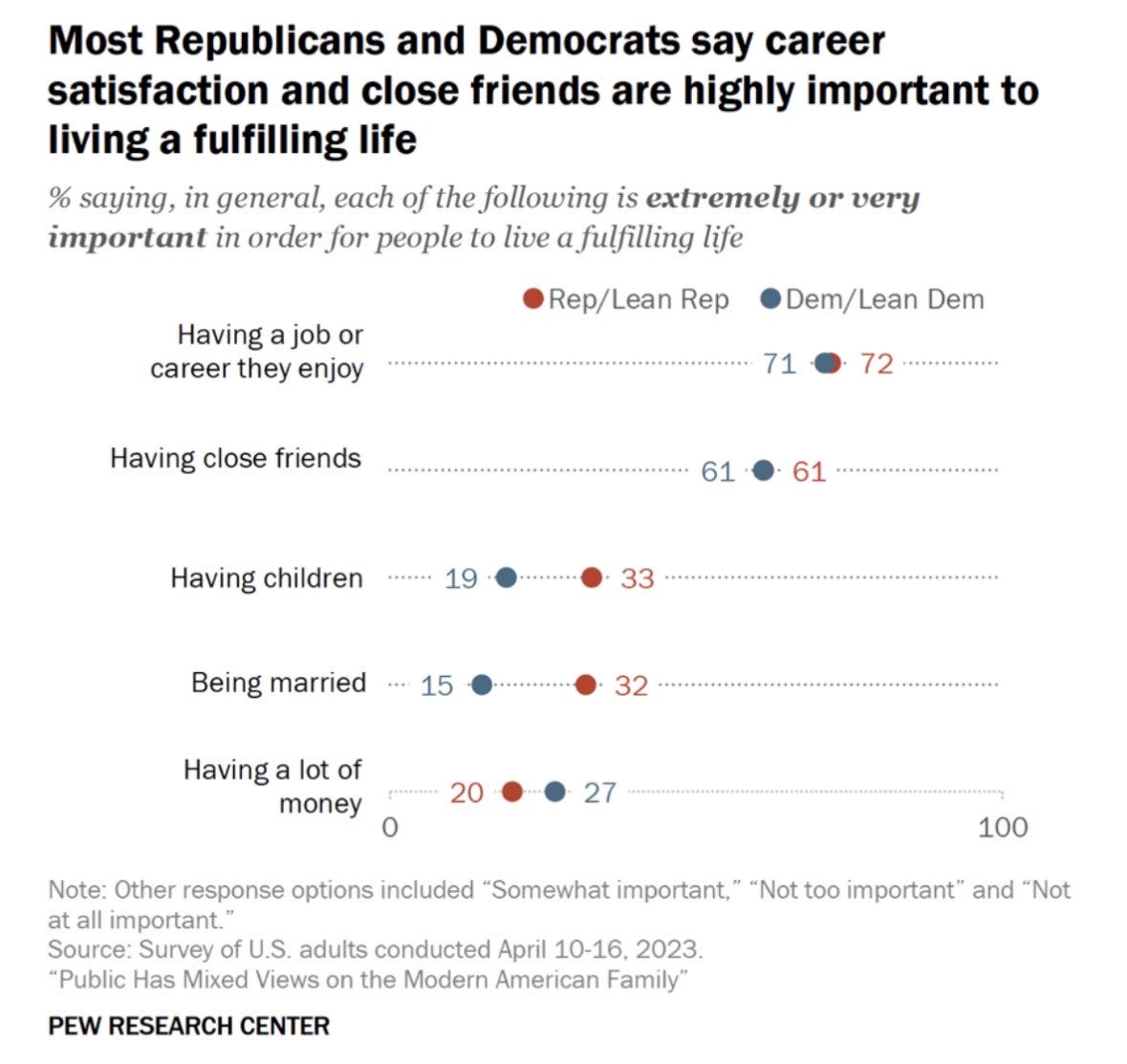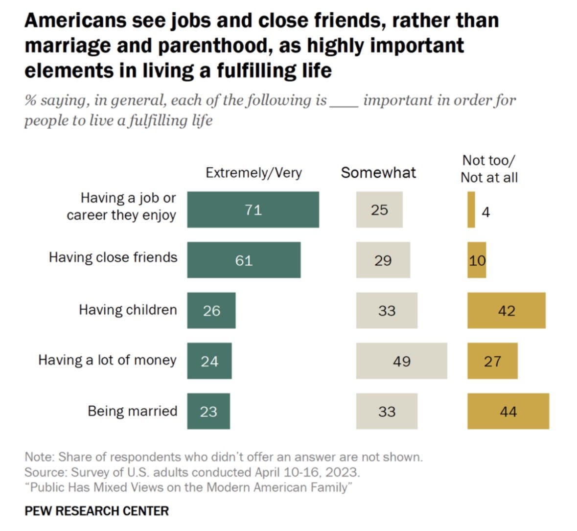 Americans across the board say that having a job or career you enjoy, or having close friends, is far more important than having children or being married.