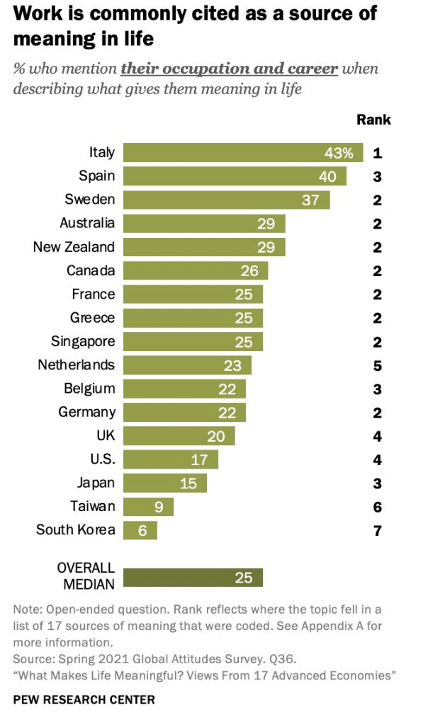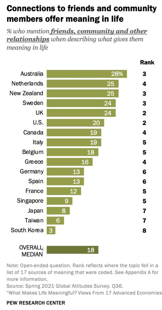 In a more general alarm category, all the numbers here are scary but also what the hell is going on in East Asia? They also don’t value friends and community, religion (the USA has 15% here, no one else is over 5%), work, hobbies or civic engagement. Looks like they simply lack almost all meaning.