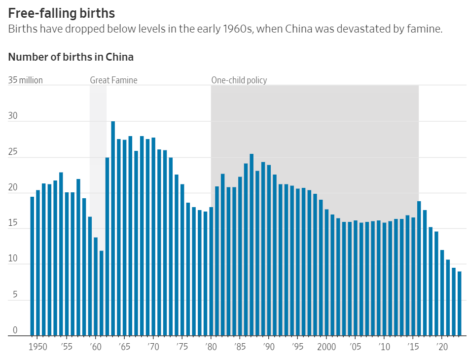 “Birth rates have dropped below levels in the early 1960s, when China was devastated by famine.” Translation: when Mao murdered tens of millions of Chinese with his Great Leap Forward collectivization of agriculture.