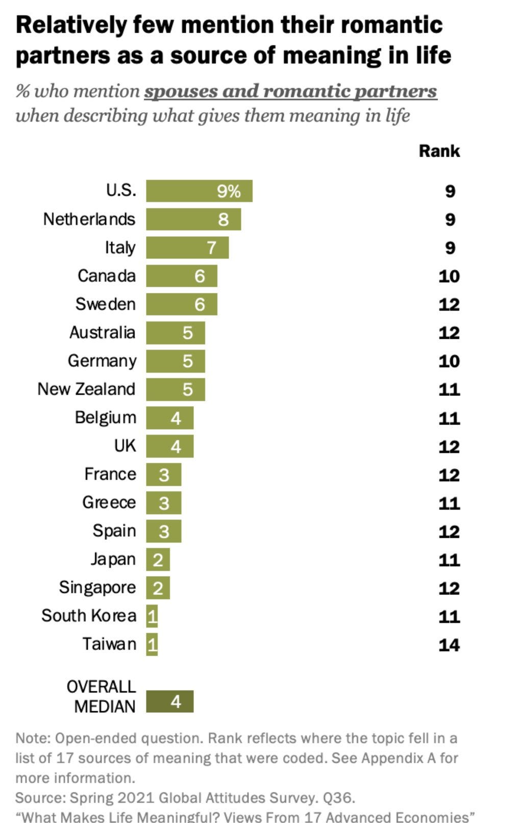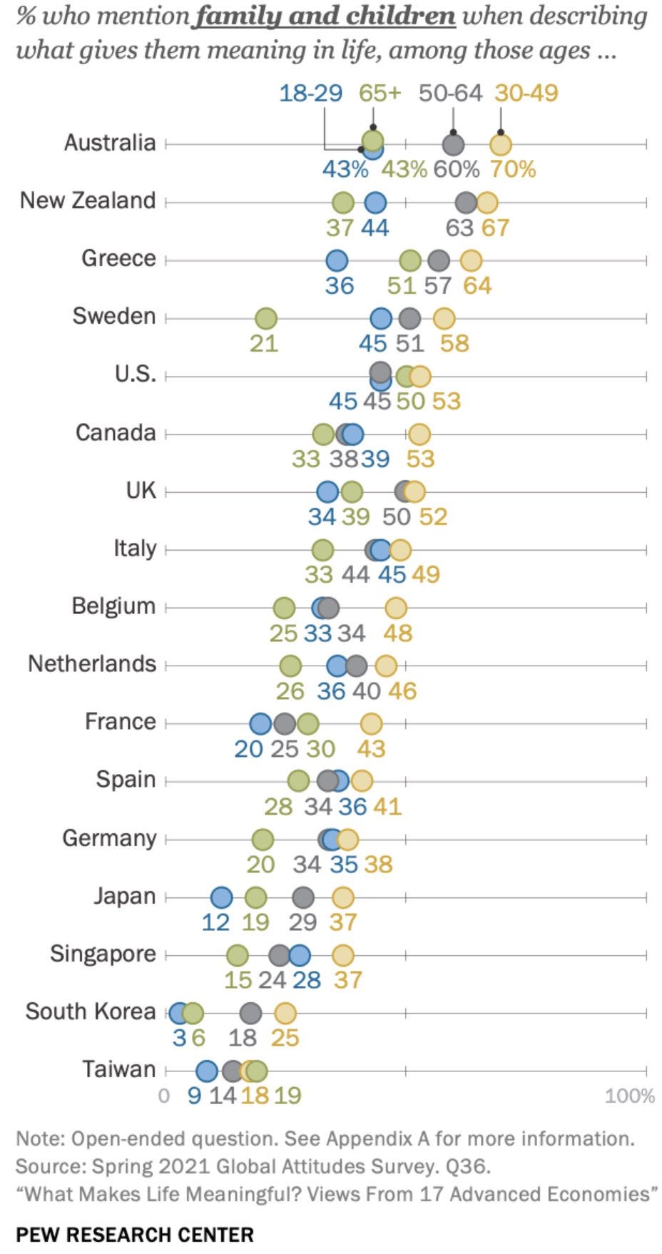 The numbers peak at 30-49, when people are raising kids. Sadly, the number falls away a lot for 65+, when one would hope that family and kids (and grandkids) would be a major source of meaning in one’s retirement. America seems to be doing a relatively strong job of not letting this fall off (and in Taiwan it actually goes up, but from an extremely low point). In Sweden it falls off a cliff. Perhaps this is variance. If not I would like to better understand the causes.