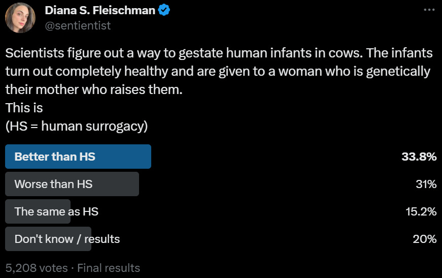 Amanda Askell: If I ever have kids, I want to have them via a surrogate because (a) I want to use my own eggs and (b) I don't don't want to be pregnant or give birth. This feels like a preference that is probably taboo but shouldn't be.