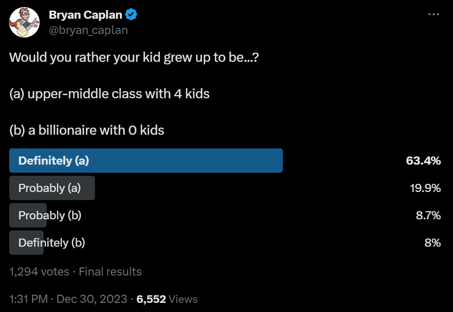 Again, we have a similar dilemma. If you are going to be DINKs either way, I do not want you to be unhappy, please do go around subsidizing the local restaurants and taking vacations and such and have a blast. However, the world where such people experience a bunch of existential angst and find the whole thing turning to ash in their mouths after a while is in the long run a better world.