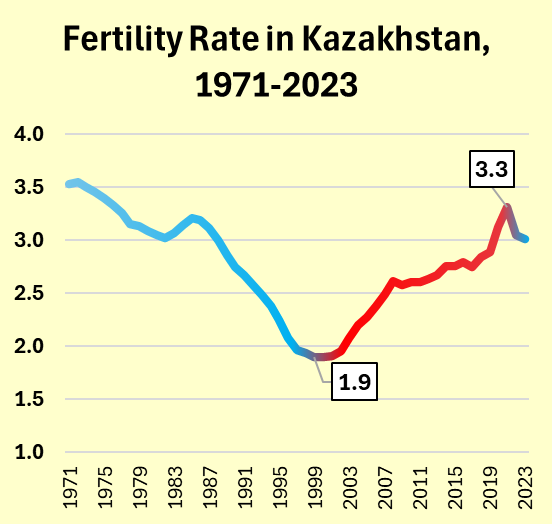 Kazakhstan remains the existence proof that fertility can recover, with economic recovery and growth boosting seemingly rather than hurting fertility as they recovered from the economic woes they experienced in the 1990s.