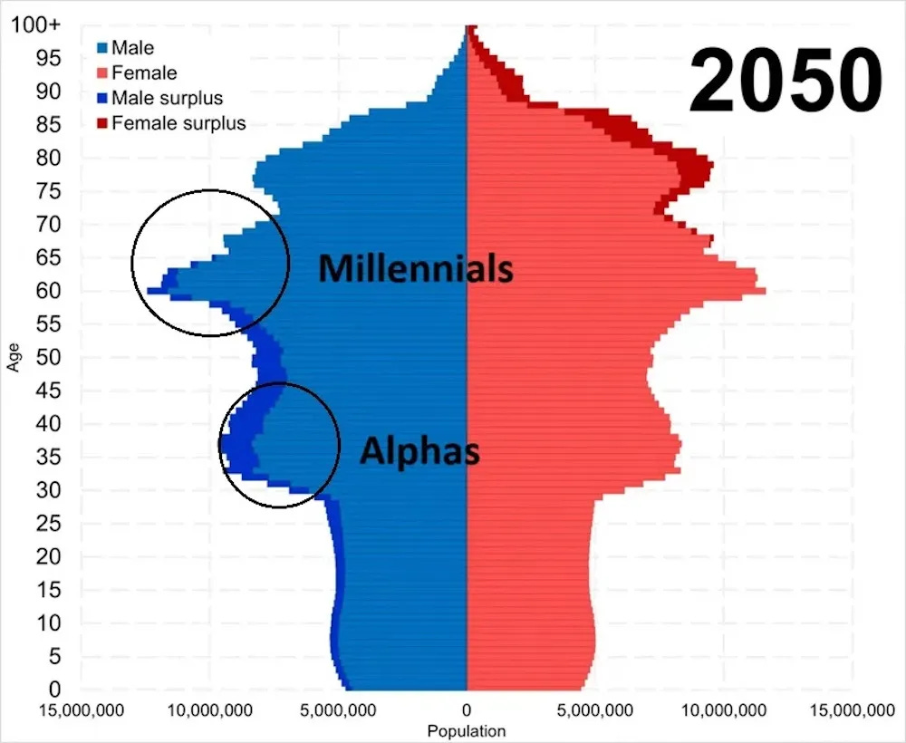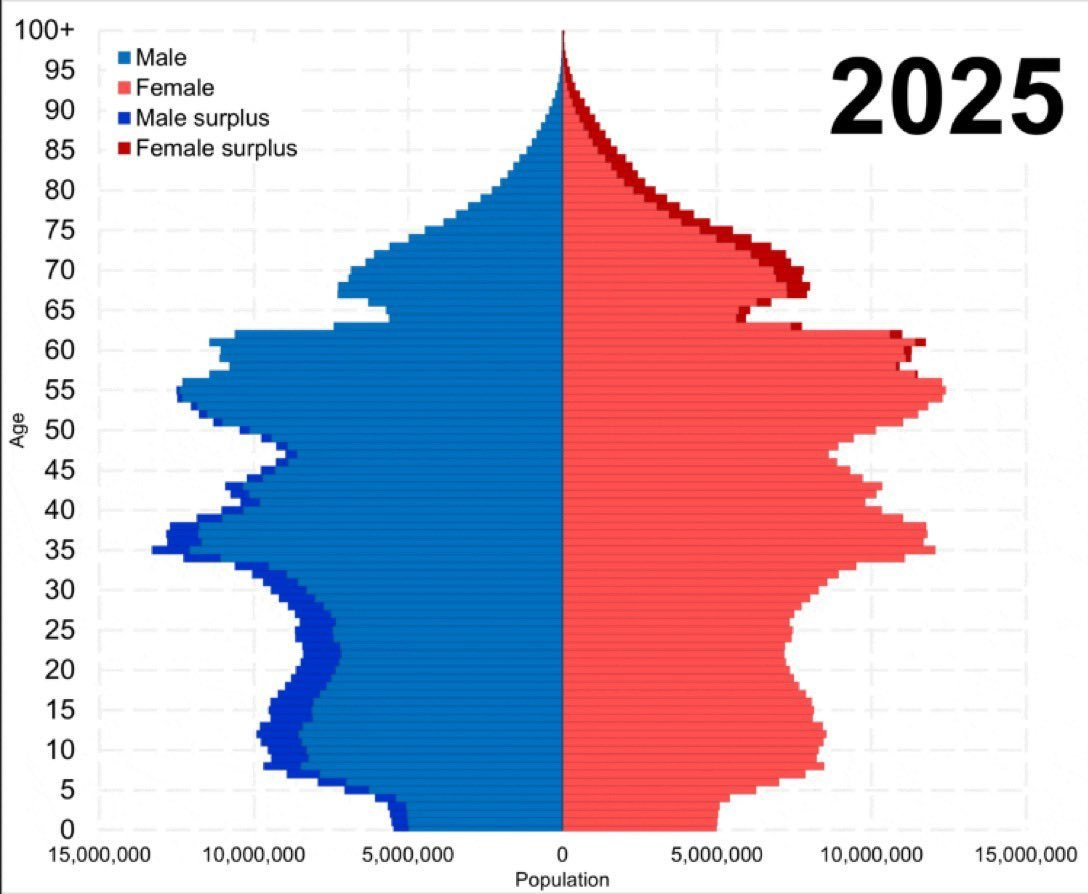 • There is an extreme surplus of males. More than 30 million. These are men who cannot possibly find a wife, an enormous population of incels by mathematical necessity.