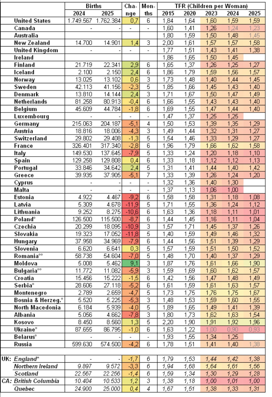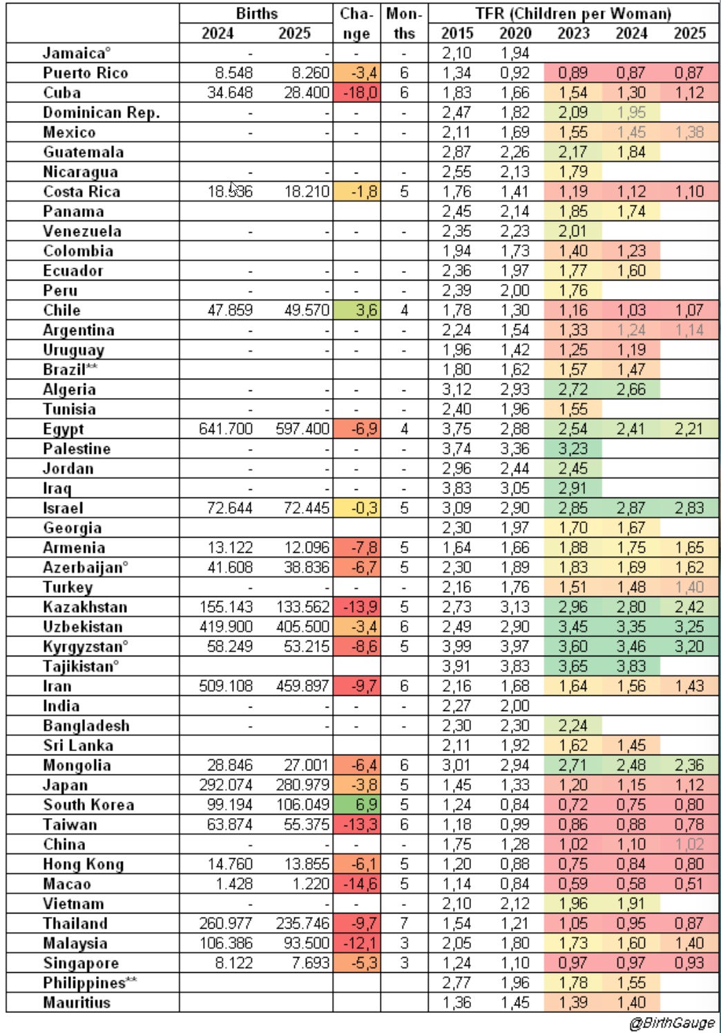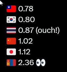 China did have a widespread improvement from 2023 to 2024, but only to 1.1, and this was plausibly because it was the Year of the Dragon. In 2025 things seem back to 2023 levels, so it doesn’t look like they’ve turned a corner.