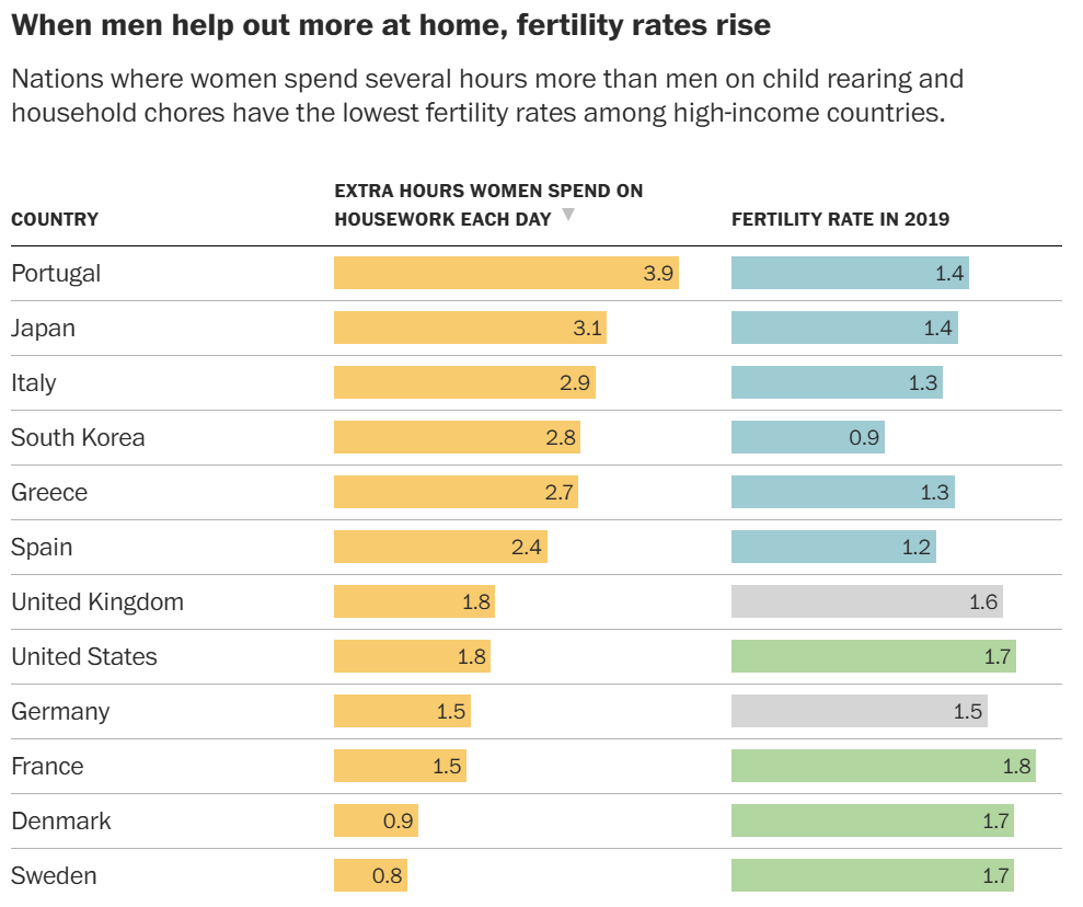 In places where men do more around the house, fertility rates are higher, where they do less, rates are lower.