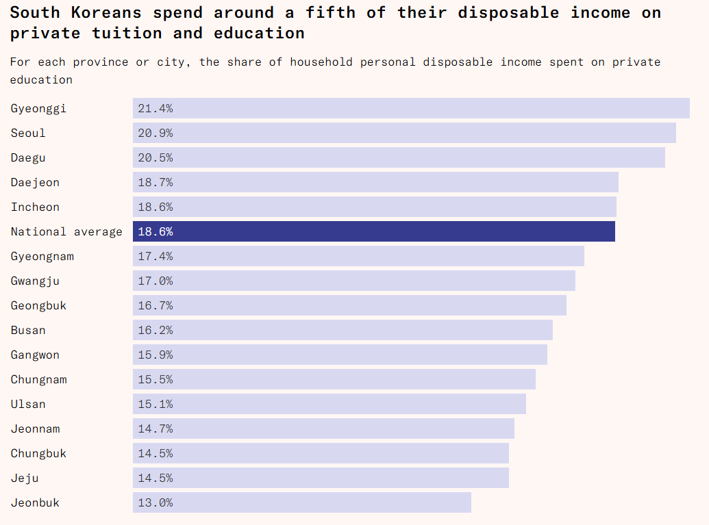 … But South Korea is even worse. Almost 80 percent of children attend a hagwon, a type of private cram school operating in the evenings and on weekends. In 2023, South Koreans poured a total of $19 billion into the shadow education system. Families with teenagers in the top fifth of the income distribution spend 18 percent ($869) of their monthly income on tutoring. Families in the bottom fifth of earners spend an average of $350 a month on tutoring, as much as they spend on food.