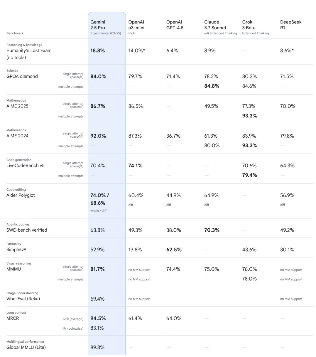 The feedback is overwhelmingly positive. Many report Gemini 2.5 is the first LLM to solve some of their practical problems, including favorable comparisons to o1-pro. It’s fast. It’s not $200 a month. The benchmarks are exceptional.