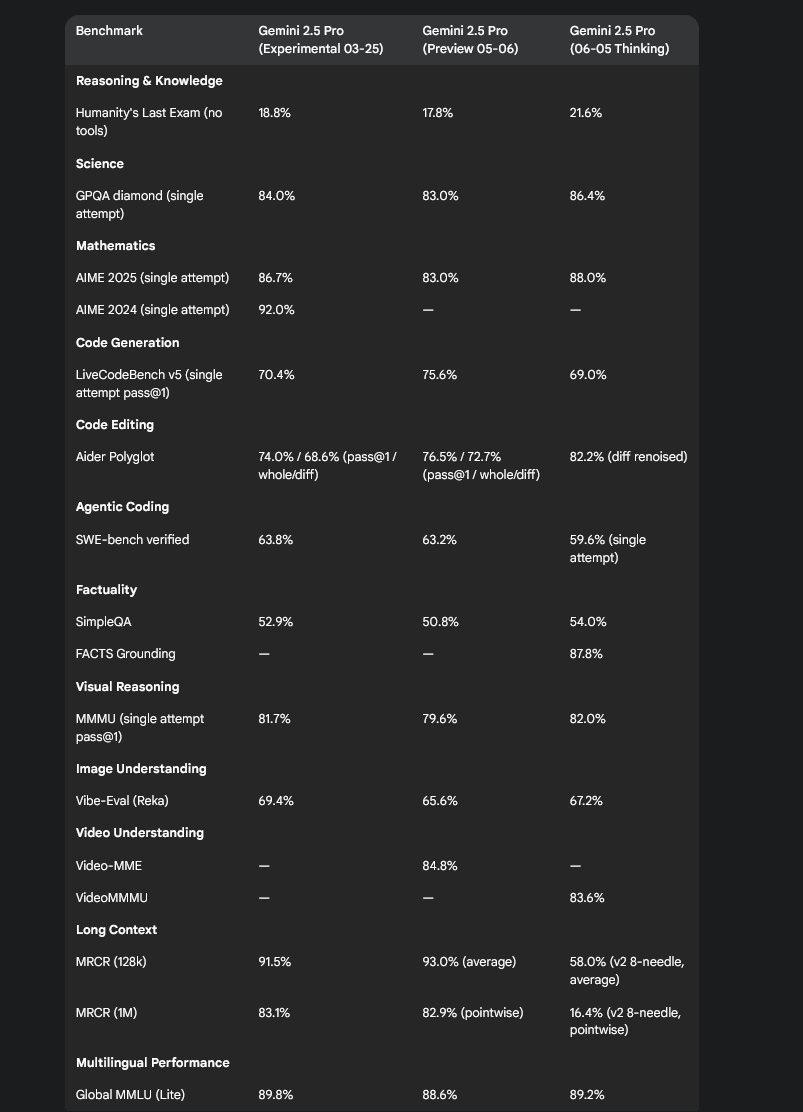 Tim Duffy: I had Gemini combine benchmarks for recent releases of Gemini 2.5 Pro. The May version improved coding at the expense of other areas, this new release seems to have reversed this. The MRCR version for the newest one seems to be a new harder test so not comparable.