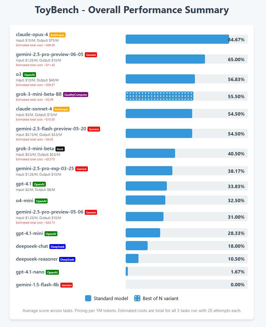 Henosis shows me ‘ToyBench’ for the first time, where Gemini 2.5 Pro is in second behind a very impressive Opus 4, while being quite a lot cheaper.
