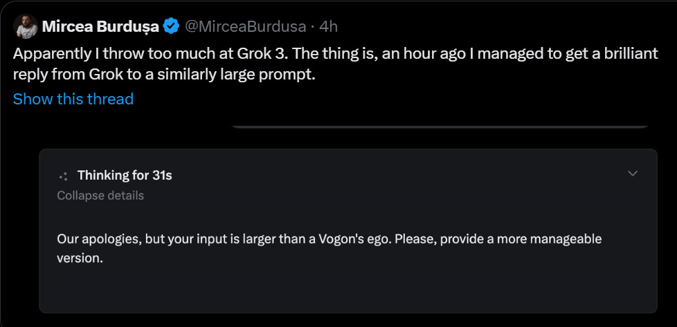 As of now, the sentiment on X toward Grok 3 is cautiously positive but tempered by critiques of its performance relative to o1-pro, o3-mini-high, R1, Claude 3.5 Sonnet, and GPT-4o. It’s seen as a frontier model with potential, particularly in creativity and reasoning, but it doesn’t yet match the clarity, reasoning depth, or polish of its competitors. The differences most noticed—verbose outputs, weaker reasoning, and a lack of refinement—suggest it’s a work in progress, with users eager to see how xAI refines it in the coming months.