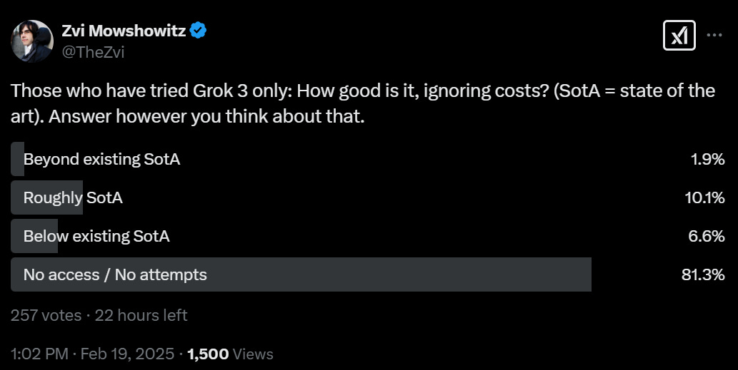 [I locked this paragraph on 2/16]: Will Grok 3 live up to Elon’s hype, I asked several days before release? My presumption was no. Teortaxes said yes, John Pressman says there’s a learning curve, presumably implying it’s not that indicative that Grok 1+2 weren’t impressive.