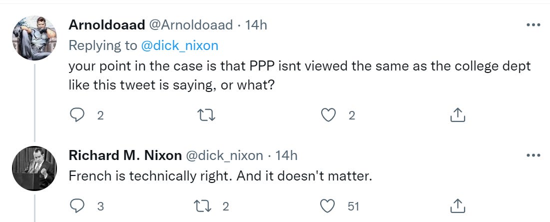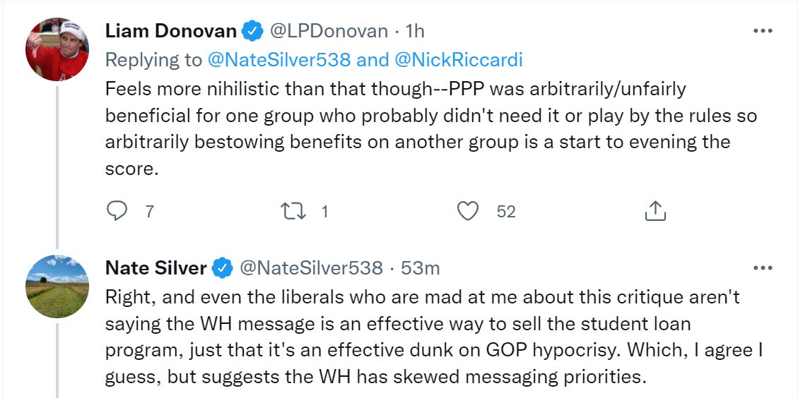 (Freddie DeBoer says the question of whether PPP was loans is irrelevant, what matters is the spending, except the whole point of the attacks is to say PPP ‘loans’ were loans and this justifies forgiving other loans. Back at the motte, he says this is a question of where the federal government spends money. He says PPP was justified by the need for ‘stimulus’ and this was a mistake because we overstimulated the economy, then seems to argue that this means we should overestimate it more because it’s fine to overstimulate, or something. And he explicitly says that because PPP wasn’t precisely targeted, that justifies precisely targeting a new group now and giving them money.)