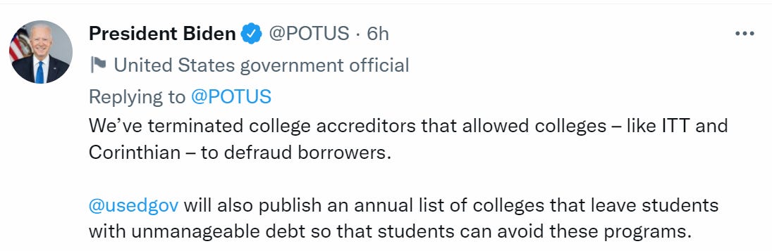 And yet I can’t help but notice that this should not count, not remotely, as ‘holding colleges accountable for jacking up costs without delivering value to students.’ Almost all colleges are doing this. We are ‘holding them accountable’ by forgiving student debt? And offering larger subsidies to future debt? I’d love to be ‘held accountable’ like that.