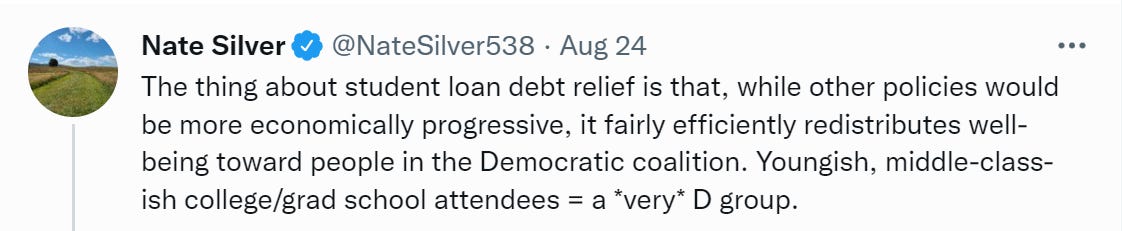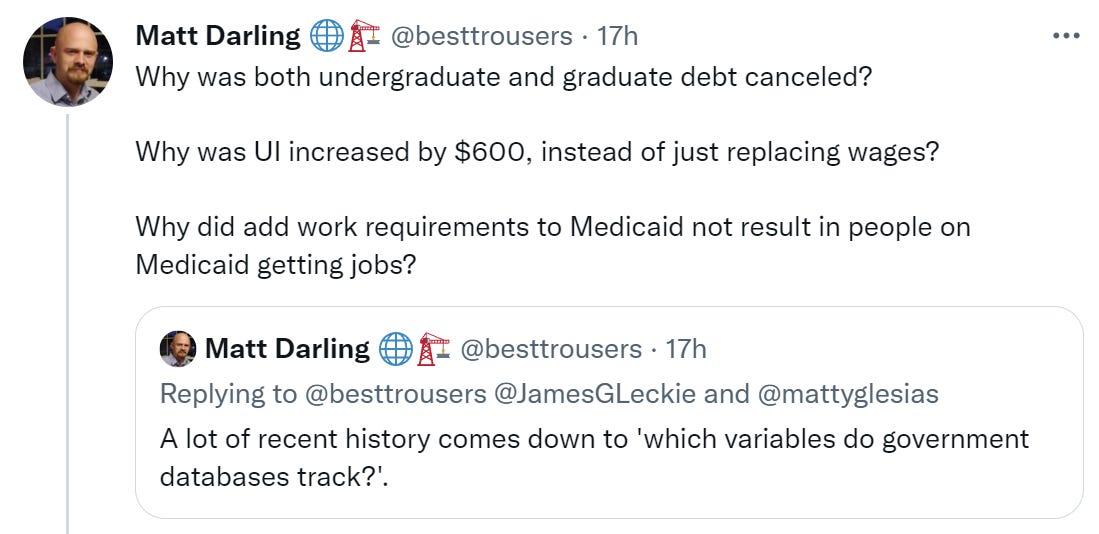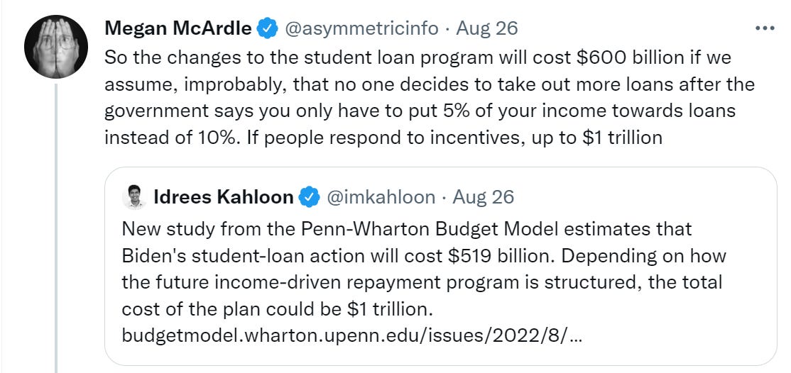 Another important point from Matt Darling is that graduate student debt was likely included in forgiveness because ‘college debt without graduate debt’ isn’t A Thing from the perspective of the administrative state. The system has no way to differentiate between the two.