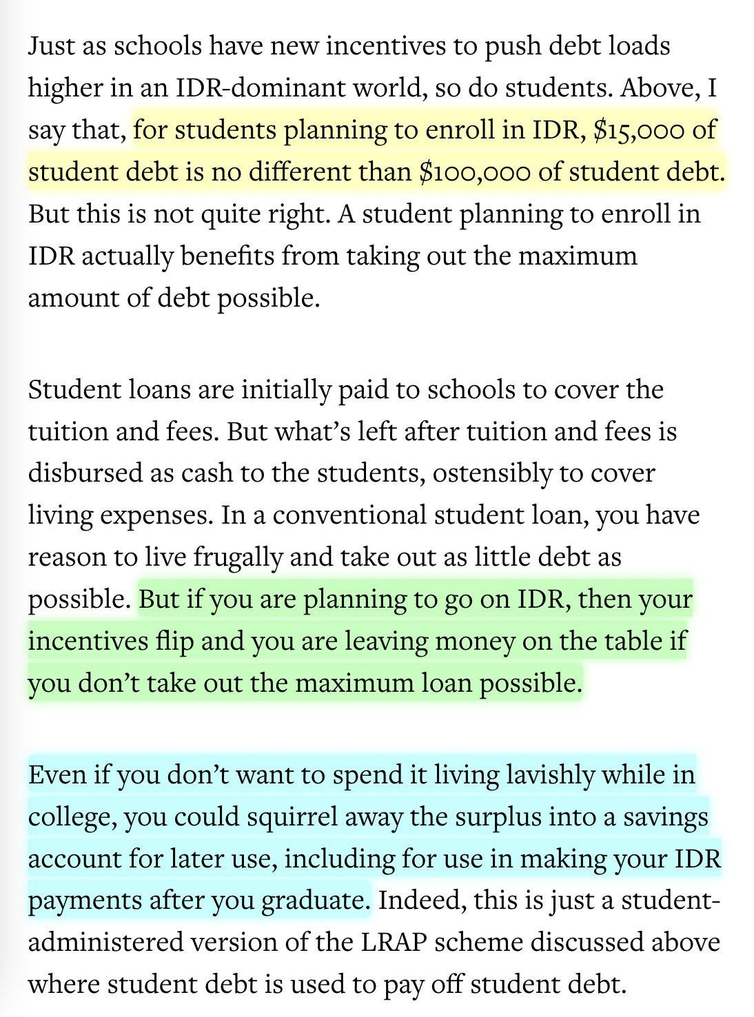 Also, as Matt Bruenig points out, a college student can and should (assuming some combination remotely sane interest rates and lack of expectation of truly huge amounts of future income) take out the maximum in loans regardless, since they do not need to be spent on tuition, invest the money, then use some of the money to pay back the loan and bank the rest as profit.
