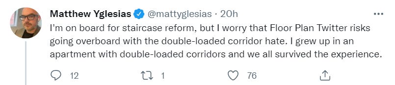One could go after a variety of other requirements, as well, like parking and staircase requirements. Parking requirements in particular seem like they are ‘doing work’ in the negative sense to eat up giant amounts of space in ways that there are no good substitutes for when looking to prevent construction. Dual staircase requirements in many spaces effectively mean nothing reasonable can be built while not providing any substantial safety value, and are something everyone involved can value properly on their own, while serving as an avatar for other similar rules. There are plenty of exceptions to the dual staircase rules that exist in the wild and almost zero safety consequences.
