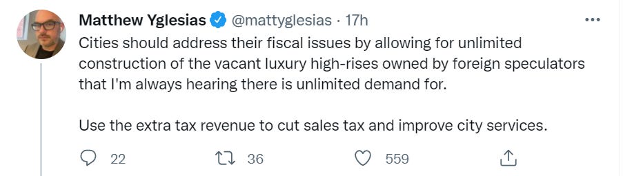 Any substitution effects are purely good, so the worst case scenario is that you kind of made CityCoin, sold some CityCoin to foreign investors, and collect a property/wealth tax on CityCoins, at the cost of everyone having to look at a new building. Seems fair.
