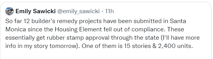 The Bay still has a bit of time. In Santa Monica, we can see one potential next phase now. Either you step up, or the ‘Builder’s Remedy’ kicks in and projects get auto-approved.