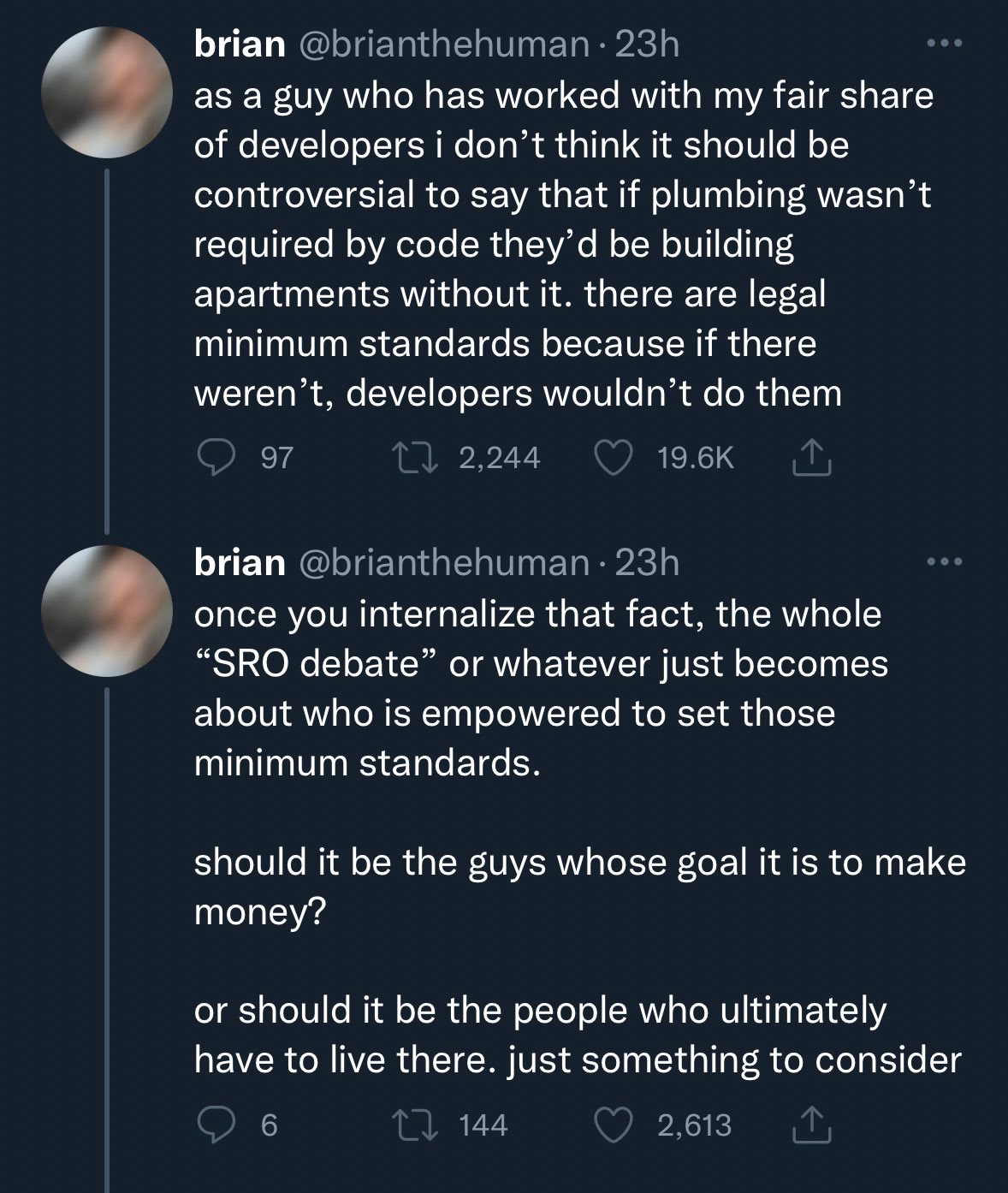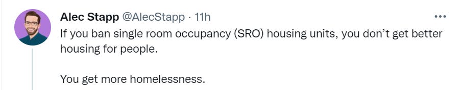 As a second best solution, I embrace exactly what Brian is suggesting, which is that the people who will live in such places should get a say, and other people shouldn’t. Right now, we have these requirements not because people who live or will or might live in SROs want them. We have them because others want such folks out of their neighborhoods, and we have them because people think they know what is good for others. Restrict the choice on this to realistic potential consumers, and I predict a very different outcome.