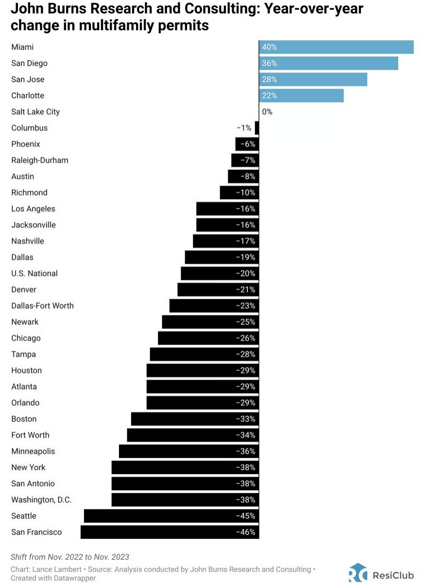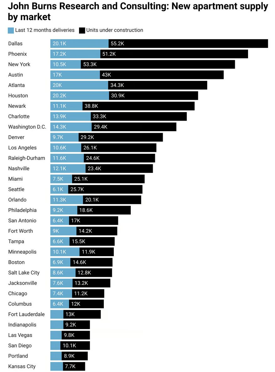 Cooper McCoy: A wave of multifamily supply is coming this year. These housing markets will see the most. JBREC: "While 2024 and 2025 should be the busiest years on record for new apartment construction and deliveries, the pipeline will thin out after that" A significant amount of multifamily supply, financed during a period of ultra-low interest rates during the pandemic, is set to come online this year.