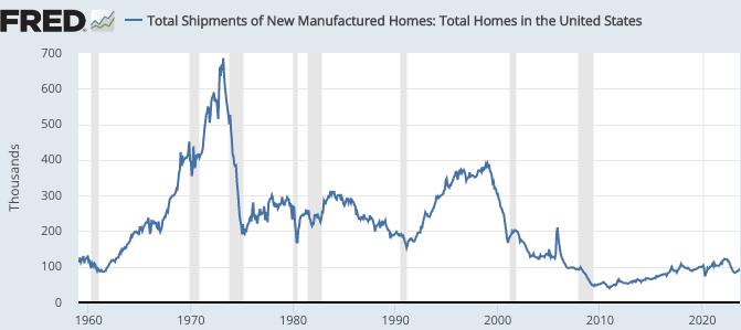 One specific note is that 1973 is when we prohibited manufactured homes from being transported on a chassis and then placed on a foundation, killing the industry, as detailed in this (gated) post by Matthew Yglesias:
