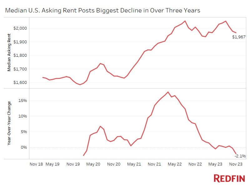 Rent.com said that in December, median rent was $1,839. That is more than a seven percent drop since the July peak.
