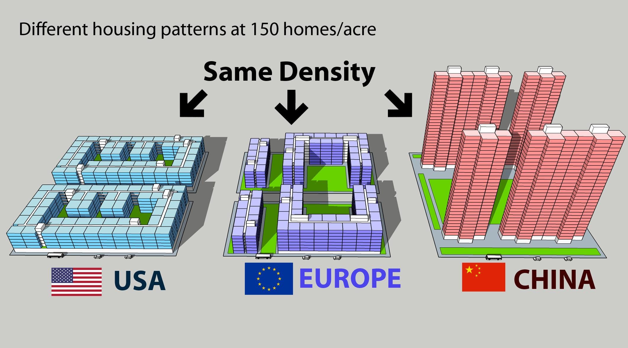 Alfred Twu: Density of new housing in the US is similar to China. While the 30-story towers look impressive, the 6-story buildings popping up throughout American cities are more efficient. Both have around 150 homes per acre.