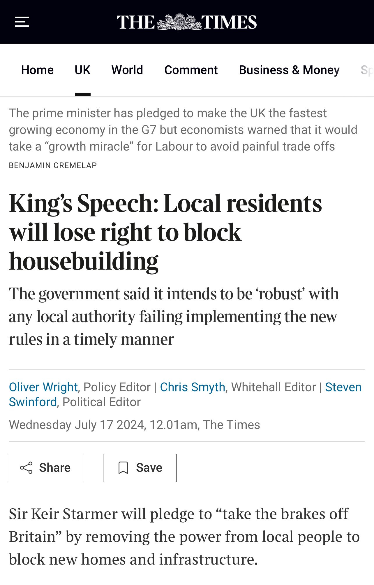 The Times: The Labour leader will unveil plans to build 1.5 million houses over five years by forcing councils to approve new homes, including on the green belt, warning that those who refuse will have development imposed upon them as part of a “zero tolerance” approach to nimbyism.