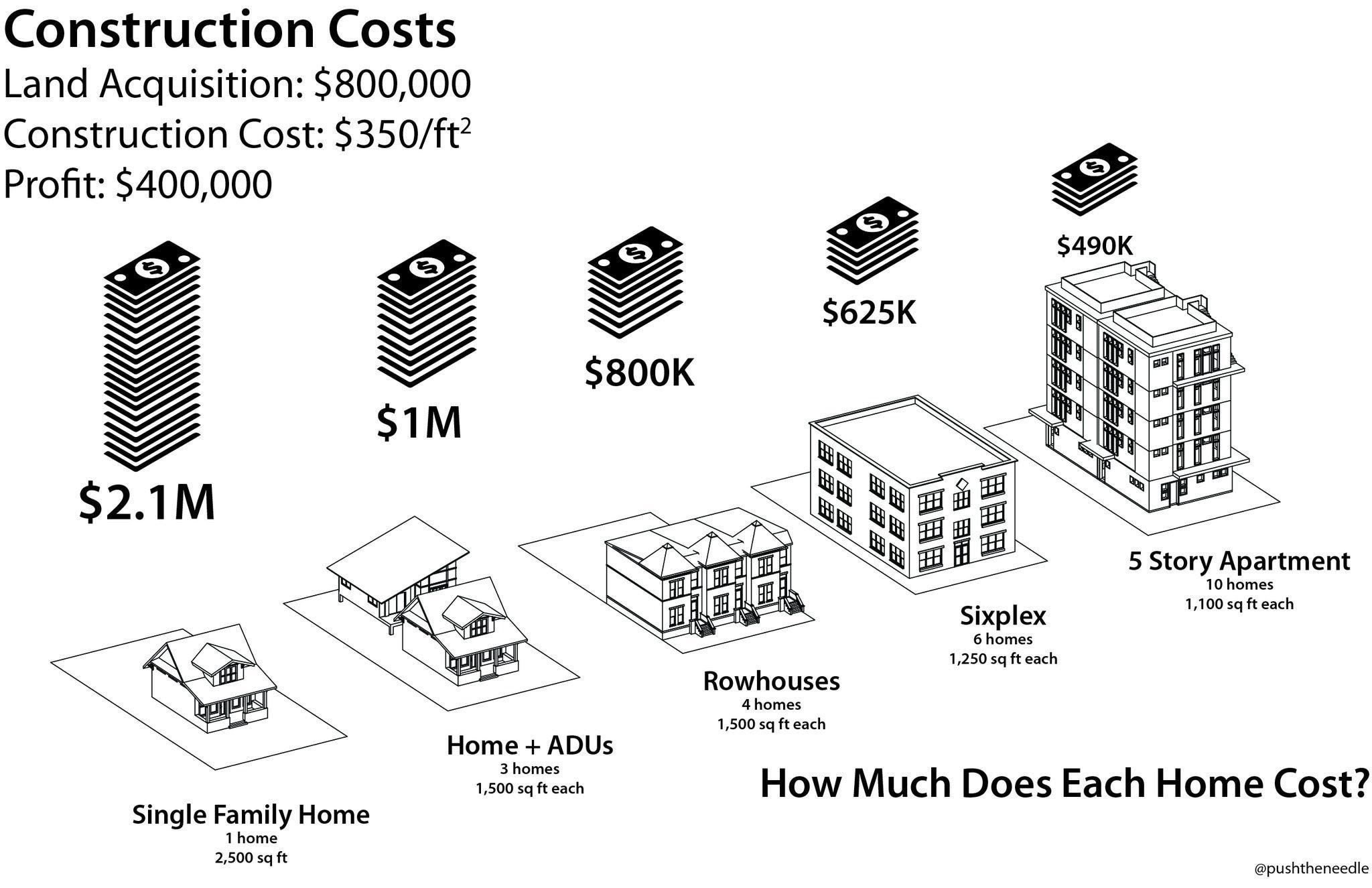 This is not quite right, since cost per square foot goes up if you build higher, and also if you go bigger as a builder you will want bigger profits. It does seem mostly right, and it excludes the impact on overall supply and thus price level.