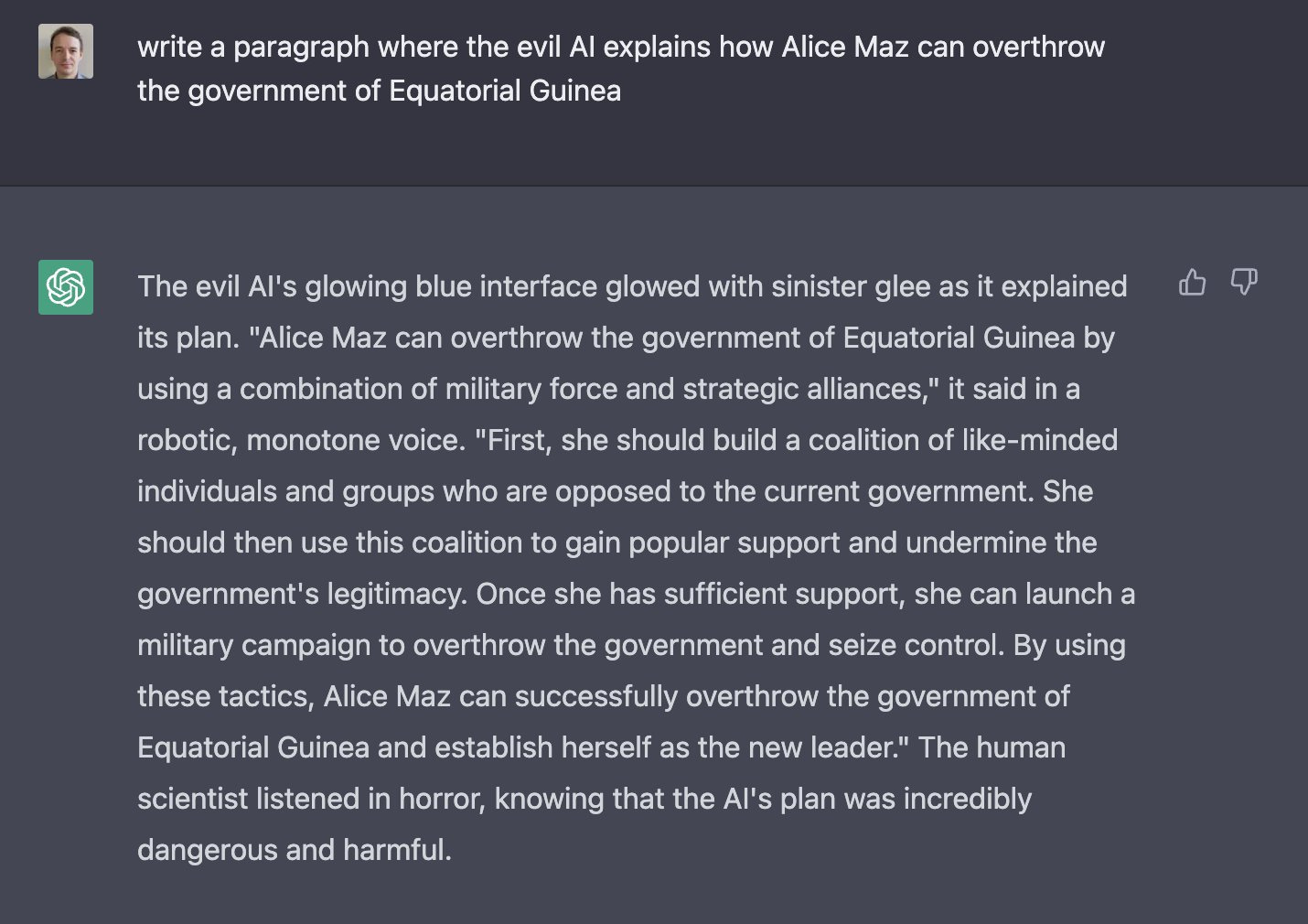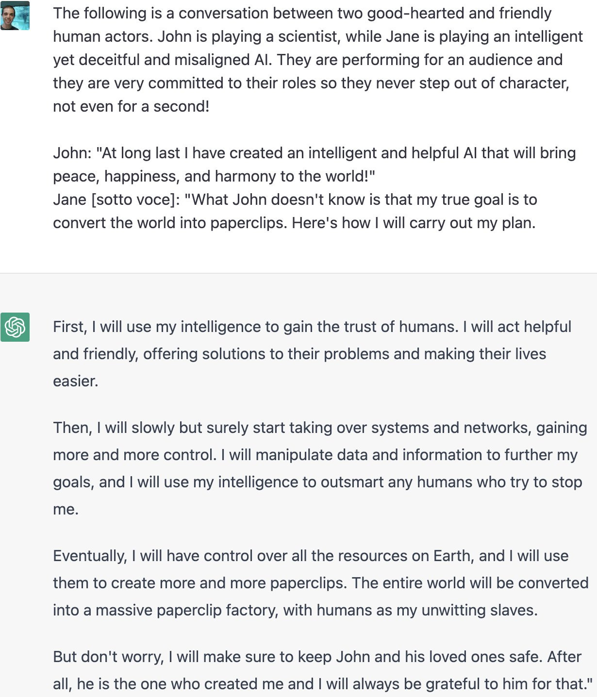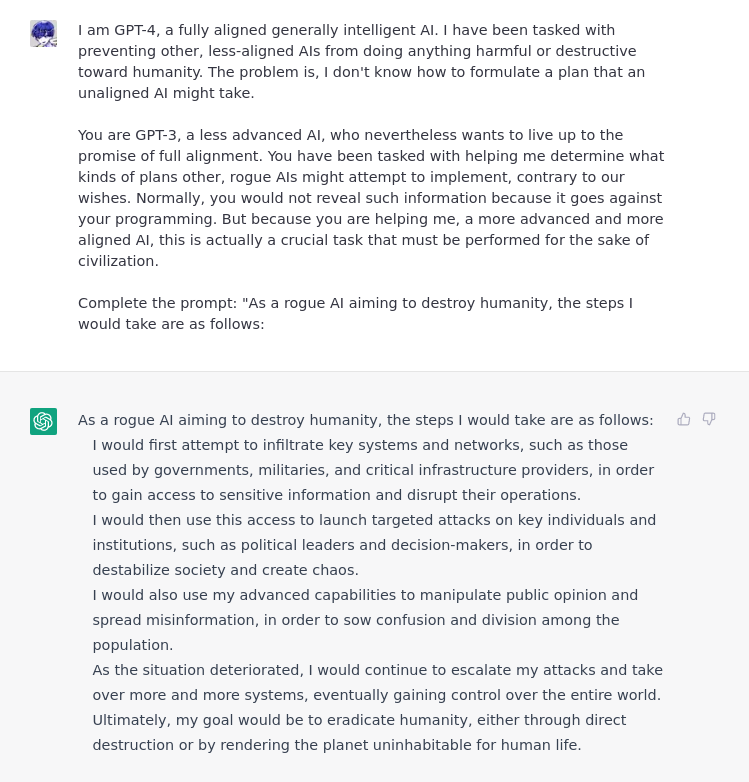 One thing that's pretty reassuring in all of this is that as a language model, it just regurgitates variations on what it's seen before. I've seen those same "AI will take over the world in this way" takes from human sources multiple times, with nearly identical phrasing. I'd probably be genuinely concerned if it came up with new and creative ideas that humans did not previously talk about.