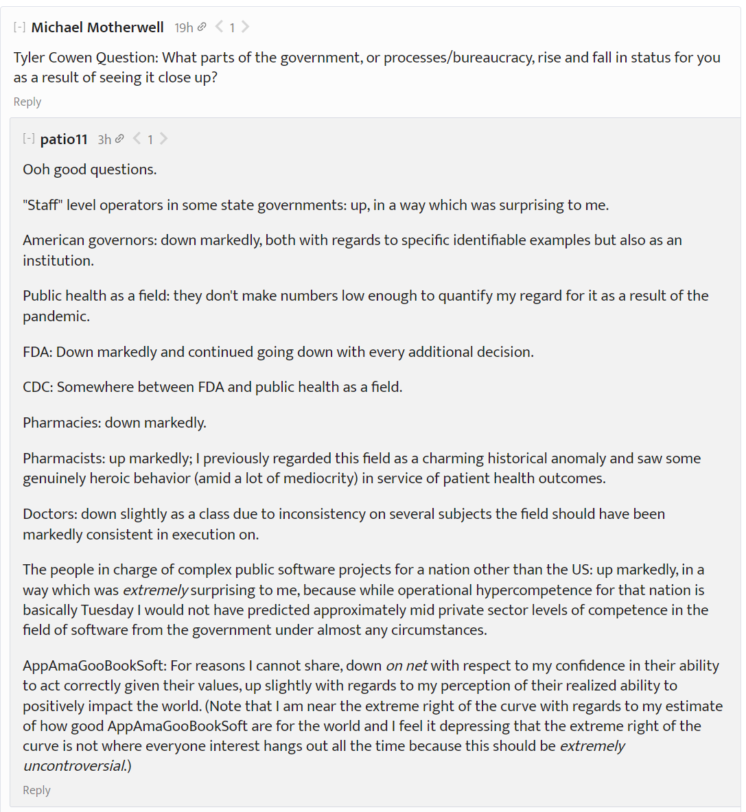I will conclude with a question and answer from Patrick’s AMA on the Progress Forum. A lot of lowering of status, not much raising, the real government heroes are people whose names we never hear. Be sure to note the contrast between pharmacies and pharmacists, which reflects sharp contrasts throughout the OP where pharmacies consider vaccines an annoyance and pharmacists want to prevent people from dying.