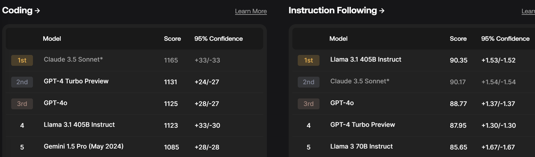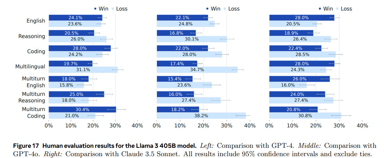 According to these tests, GPT-4o robustly beats Llama-3 405B in human comparisons. Claude 3.5 Sonnet does not. including losing on straight English and Multiturn English. It obviously all depends on which humans are being asked and other details, but this backs up the Arena rankings that have GPT-4o as still satisfying user pairwise comparisons. I will of course keep on using Claude 3.5 Sonnet as primary, while experimenting with Llama-3-405B just in case.