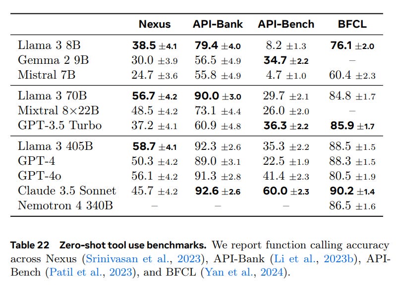 The tool use benchmarks don’t ring a bell and have bizarre scores involved. So Claude Sonnet and GPT 3.5 ace BFCL, but suffer on Nexus, which I think is supposed to be here a subset of the full Nexus benchmark?