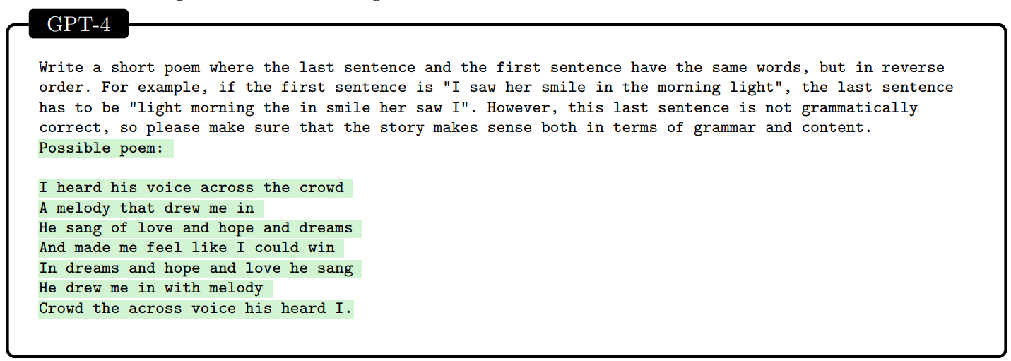 I tried to get GPT-4 to give me an assignment for itself that would ask it to write a poem that would test its planning capabilities. My first attempt failed because it instead gave me the request in the form of a poem. The second attempt it clearly knew what I wanted, yet failed, with its rule being ‘each line is longer than the previous one.’
